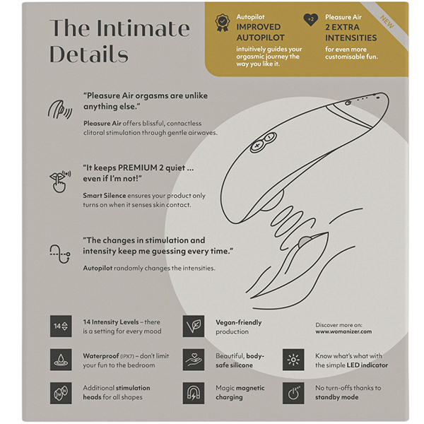 ボタンを押さなくてもお肌に触れるだけで吸引できるタッチセンサーを搭載!あのウーマナイザープレミアムがバージョンアップした「ウーマナイザー プレミアム2 (グレー)」。吸引強弱機能は12から14段階へパワーアップ!パイロットモードを搭載することで、ボタンの操作をしなくてもウーマナイザーが吸引の強弱を自動でコントロールしてくれます。振動は弱・中・強の3段階!予測できない楽しみを味わいたいという人はもちろん、カップルさんで使うときにもこれらの機能は大活躍♪ボタン操作に慣れていない方でも感覚的にお楽しみ頂けます。素材はシリコン/ABS樹脂で2時間のフル充電で連続4時間の使用が可能です。※製造時期によりパッケージが異なる場合がございます。※こちらの商品は受注発注商品の為、ご注文から発送までに3、4営業日掛かる場合が御座います。 |