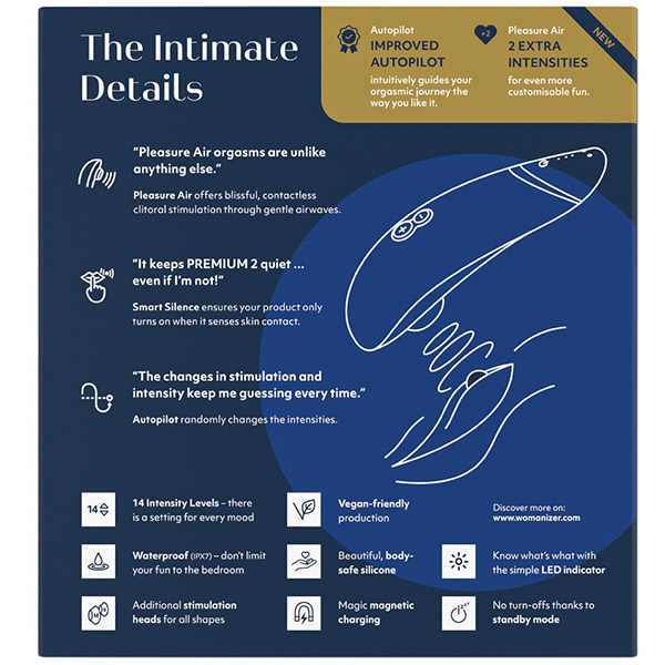 リアルなオーラルセックスでは体験できない快感が味わえる「ウーマナイザー プレミアム2 (ブルーベリー)」。従来品からパワーアップした本作では、ボタンを押さなくてもお肌に当てるだけで吸引が自動でスタートする「タッチセンサー」を搭載♪お肌から離すと吸引も自動でストップするので、ボタン操作に慣れていない人でも感覚的に楽しめます。また、強弱3段階の「パイロットモード」も搭載しているので予測できない楽しみを味わいたい!という人にもおすすめ。ボタン操作をしなくても吸引の強弱を自動でコントロールしてくれるので、ゆったりとラグジュアリーな時間を楽しみたいときにも最適♪吸引強弱機能は12から14段階へ!素材はシリコン/ABS樹脂で2時間のフル充電で連続4時間の使用が可能です。※製造時期によりパッケージが異なる場合がございます。※こちらの商品は受注発注商品の為、ご注文から発送までに3、4営業日掛かる場合が御座います。 |