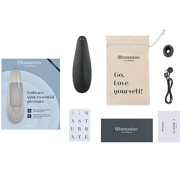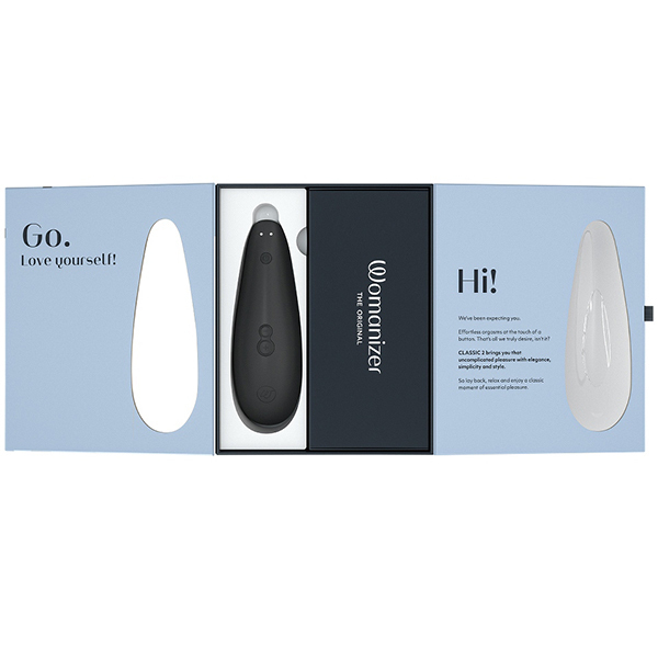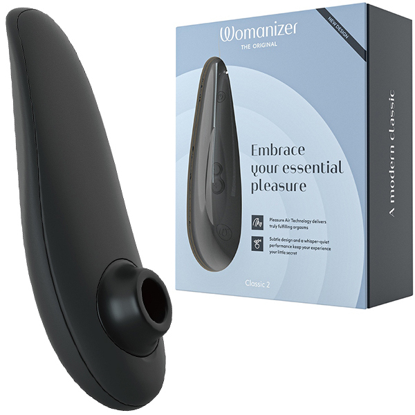 従来のバイブとは違い、クリトリスを吸うことを目的とした人気のトーイ・ウーマナイザーから入門用が登場!その名も「ウーマナイザー クラシック2 (ブラック)」。プレミアムほどの高性能は要らない、でも高級感は失いたくない!そういう人のために登場したのが本作です。これから初めてのウーマナイザーを楽しむのに最適!吸引部は柔らかな肌触りの良いシリコンとなり、吸引強弱も8から10段階へ。オーガズムに達したときに電源ボタンを押すことで最弱の吸引力になる「アフタグローフューチャー」という新機能も搭載♪これによりイッたあともいきなりブツッと切れることなくゆったりとした余韻を楽しむことができます。※こちらの商品は受注発注商品の為、ご注文から発送までに3、4営業日掛かる場合が御座います。 |