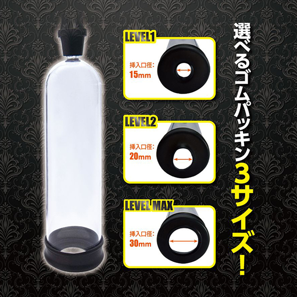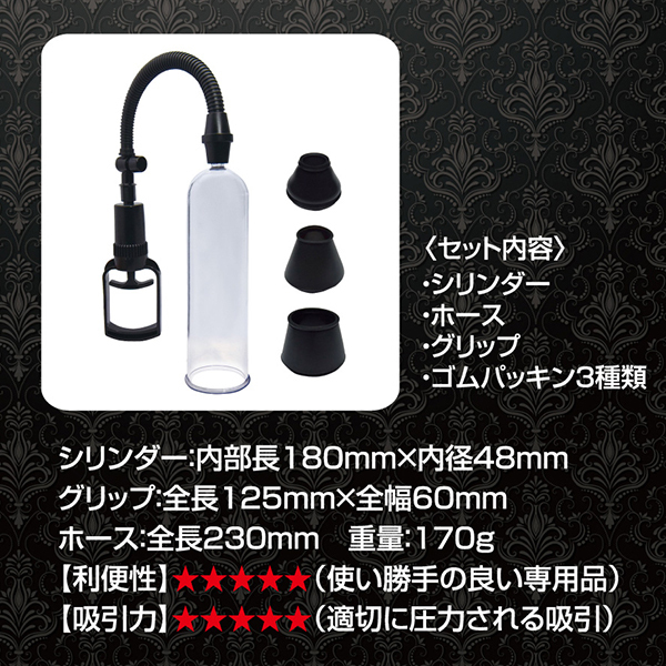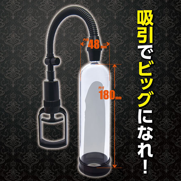 | 吸引でビッグになれ!強い男になるために開発された増大ポンプ「BIGBOY PUMP(ビッグボーイポンプ)」が新登場!簡単に片手で握れるトリガーレバーにワンプッシュの圧力開放ボタン、さらには大きさが目で分かる透明シリンダー、サイズが選べる3種類のゴムパッキンと操作性や視認性も抜群♪必要なものがすべて揃っていて、あとはレバーを握って空気を吸って、吸引圧力でメンズをビッグにするだけ!トリガーレバーは手動式なので微細な調整もコントロールも簡単♪圧力開放ボタンは安心設計でワンプッシュで吸引キャンセル!シリンダーは憧れサイズにぴったりな内寸長180ミリ×内径48ミリとなっています。挿入口のゴムパッキンは、選べる3サイズ(15ミリ、20ミリ、30ミリ)!シンプルながらもじっくり増大を計画しているならおすすめです♪ |
