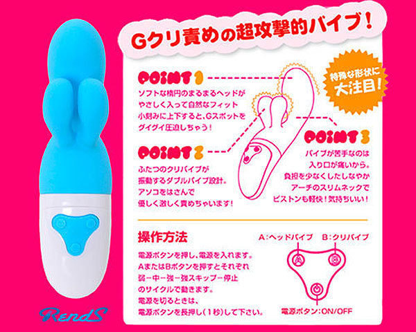 可愛すぎるフォルムに油断禁物!小さな体にパワー満載の小型バイブ。●愛らしいフォルムで大人気だった前作のミニタイプ●しなやかに曲がるソフトボディ●最大径36mm程の楕円ヘッドがGスポットを的確に刺激●ダブル突起がクリトリスを挟み撃ち●ヘッドと突起部分は個別操作可能●AorBボタンで振動を操作●電源ON/OFFは1秒長押し。前作より一回りほど小さくなって再登場!中が狭い女性でも楽しめるよう再設計されたスリムボディで、心身ともに癒されること間違いなしのコンパクトバイブです。
