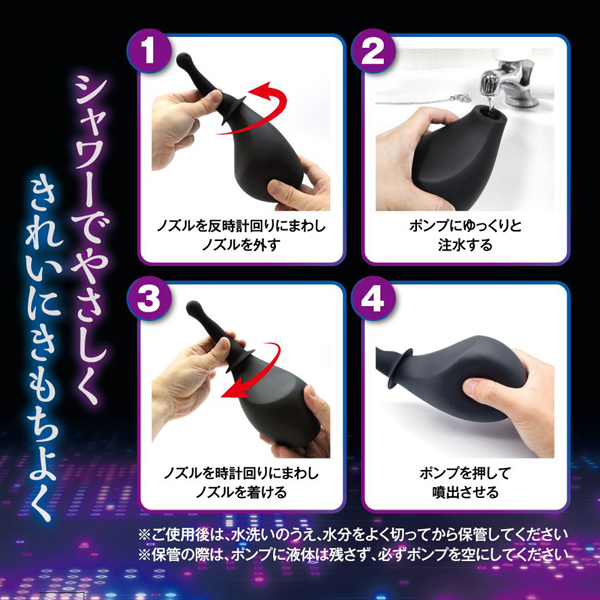 シャワーでやさしくきれいにきもちよく。アナルほか噴出洗浄器「エイナスシャワー」!ラブ・ライフにぴったりな多目的洗浄器が新登場。大容量360ミリのポンプに水を入れれば、先端ノズルの四方の穴からビュビューッと噴出できちゃいます!先端ノズルは、差し込んで使えるように、硬めのハードシリコン仕様。ポンプは、水を押し出すように、ふんわり柔らかなソフトPVC素材!ノズルとポンプは分割可能なので、注水やお手入れも簡単です。いろいろ使える噴出ポンプなので、アナルやアソコの洗浄はもちろん、オナホの内部洗浄もOK!中に液体を変えれば、ローション注入器や洗浄液注入器とも使えちゃう! |