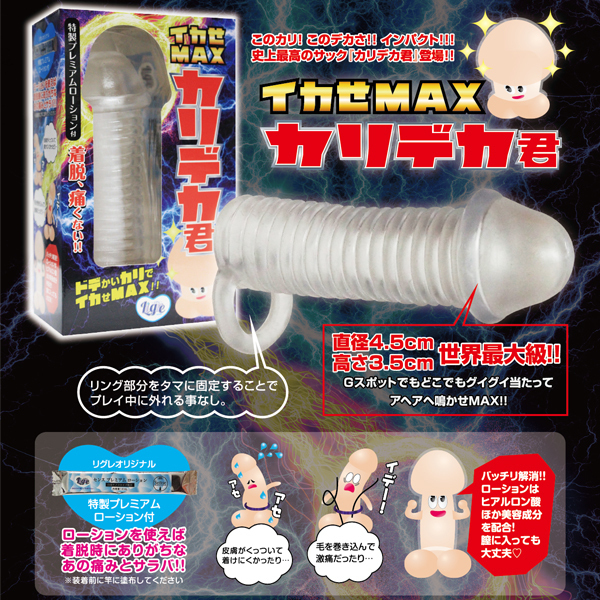 見た目の通りカリがでかく、どこでもグイグイ当たります。リングの部分を固定することで、使用時に外れる事もありません。さらに付属のプレミアムローションを塗れば、とっても簡単に且つ痛くなく装着できます。