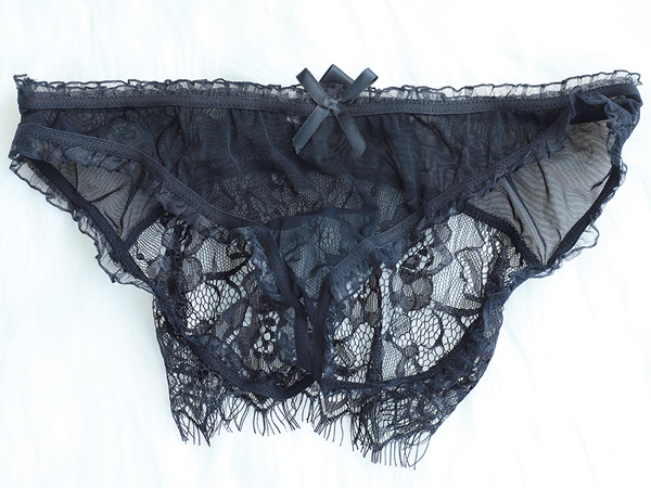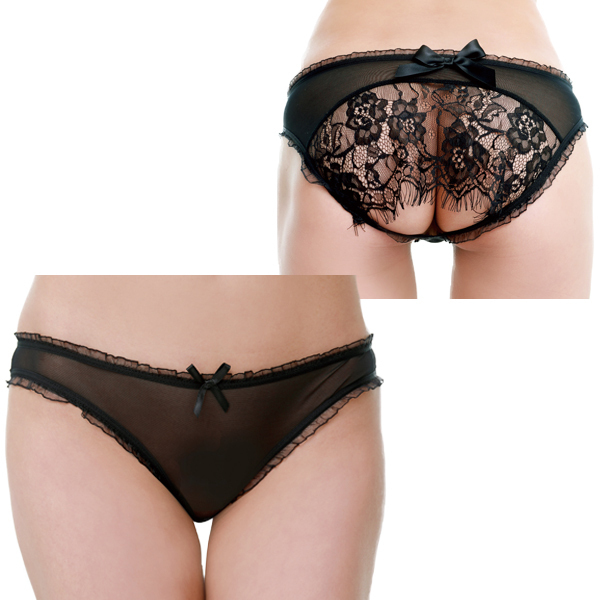 フロントはちょっと大人しめなデザインながら、バックスタイルで挑発するキュートな透明感が楽しめる刺繍デザインが魅力のプレイショーツ。ブラックのシースルー生地をベースに、フリルを使ったトリミングやリボンの装飾がカワイイ感じを演出してくれるフルバックタイプのショーツで、フロントとバックの印象が大きく違う二面性が楽しめます♪大きくラウンドカットされたヒップサイドには大きめなサテンリボンと、優雅なフローラルレースで装飾され、かなり大胆なデザインになっています!※刺繍などのデザインが異なる場合がございます。濡れたままの保管は色移りの原因になります。 |